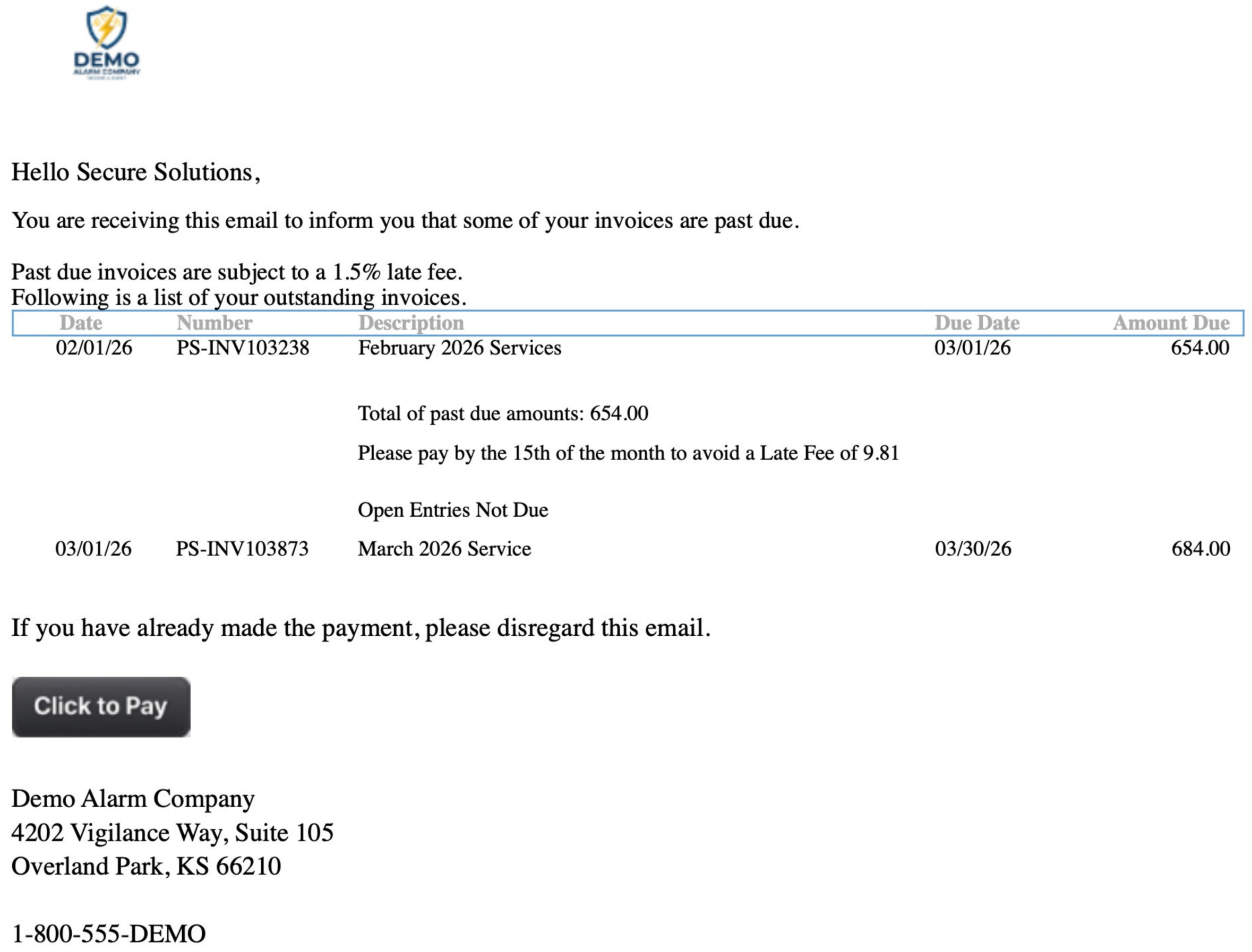 To help ensure you get paid on time, we send reminders at 5 and 10 days past due, including a PDF copy of the invoice and a Click-to-Pay option for instant payment. Copies of all unpaid invoices are also available for review at any time.